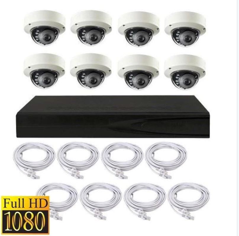 Sættet indeholder alt hvad man skal bruge. Kabler, strømforsyninger, 8 kanal POE NVR optager osv.